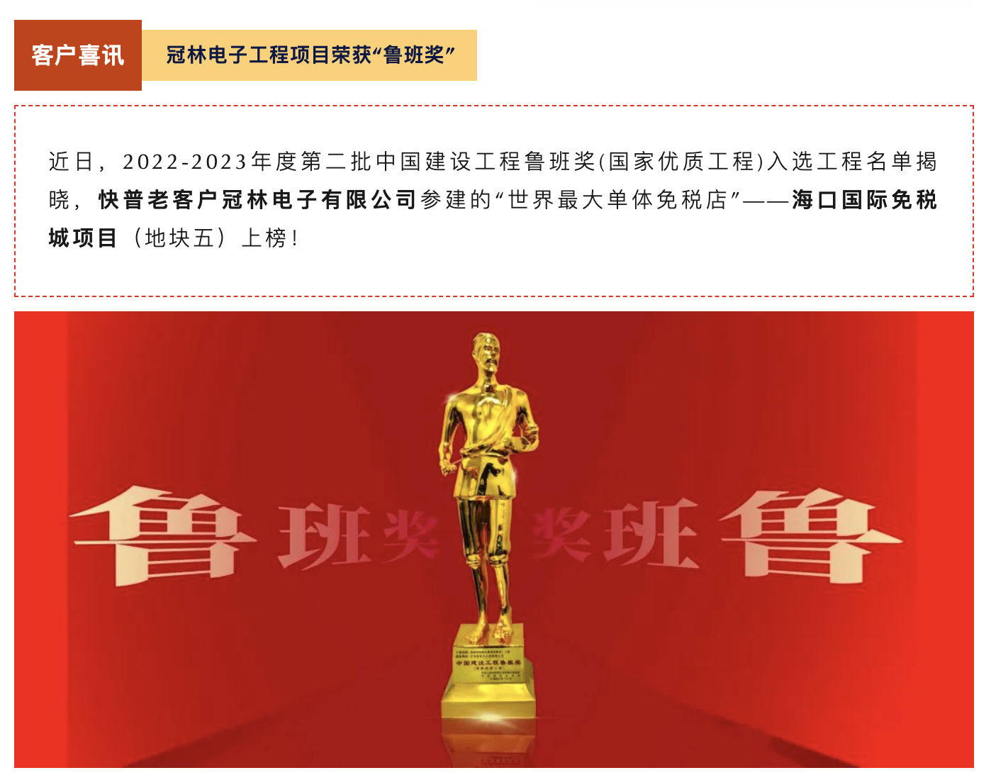 中國(guó)建設(shè)工程魯班獎(jiǎng)(國(guó)家優(yōu)質(zhì)工程)是由中華人民共和國(guó)住房和城鄉(xiāng)建設(shè)部指導(dǎo)、中國(guó)建筑業(yè)協(xié)會(huì)實(shí)施評(píng)選的獎(jiǎng)項(xiàng),是中國(guó)建筑行業(yè)工程質(zhì)量最高榮譽(yù)獎(jiǎng),被譽(yù)為中國(guó)建筑業(yè)的“奧斯卡”,主要授予中國(guó)境內(nèi)已經(jīng)建成并投入使用的各類新(擴(kuò))建工程,且工程質(zhì)量應(yīng)達(dá)到國(guó)內(nèi)領(lǐng)先水平。