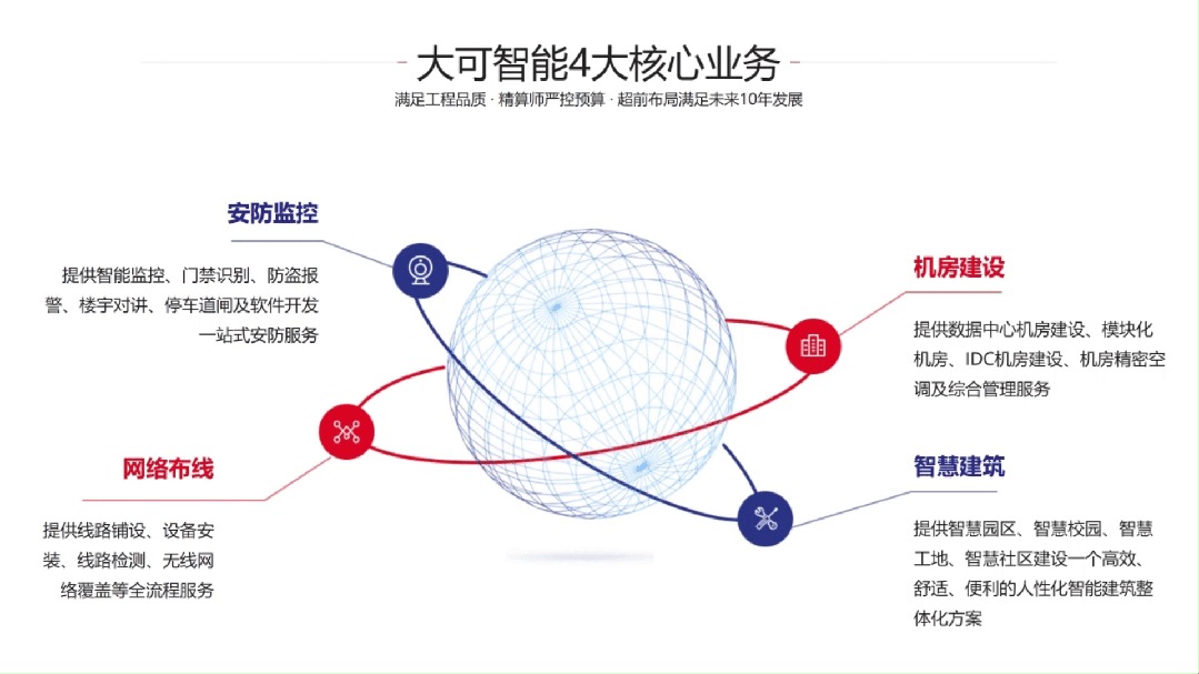 江蘇大可智能工程有限公司(以下簡(jiǎn)稱“江蘇大可”)成立于 2010 年,是一家領(lǐng)先的弱電智能化系統(tǒng)綜合方案提供商,專注智慧建筑整體解決方案設(shè)計(jì)與施工,以及大型企業(yè)弱電系統(tǒng)集成,包括安全防范系統(tǒng)、網(wǎng)絡(luò)綜合布線系統(tǒng)、核心機(jī)房工程、多媒體廣播系統(tǒng)、智能樓宇控制系統(tǒng)等,同時(shí)圍繞集成項(xiàng)目開(kāi)展銷售和運(yùn)維服務(wù)。